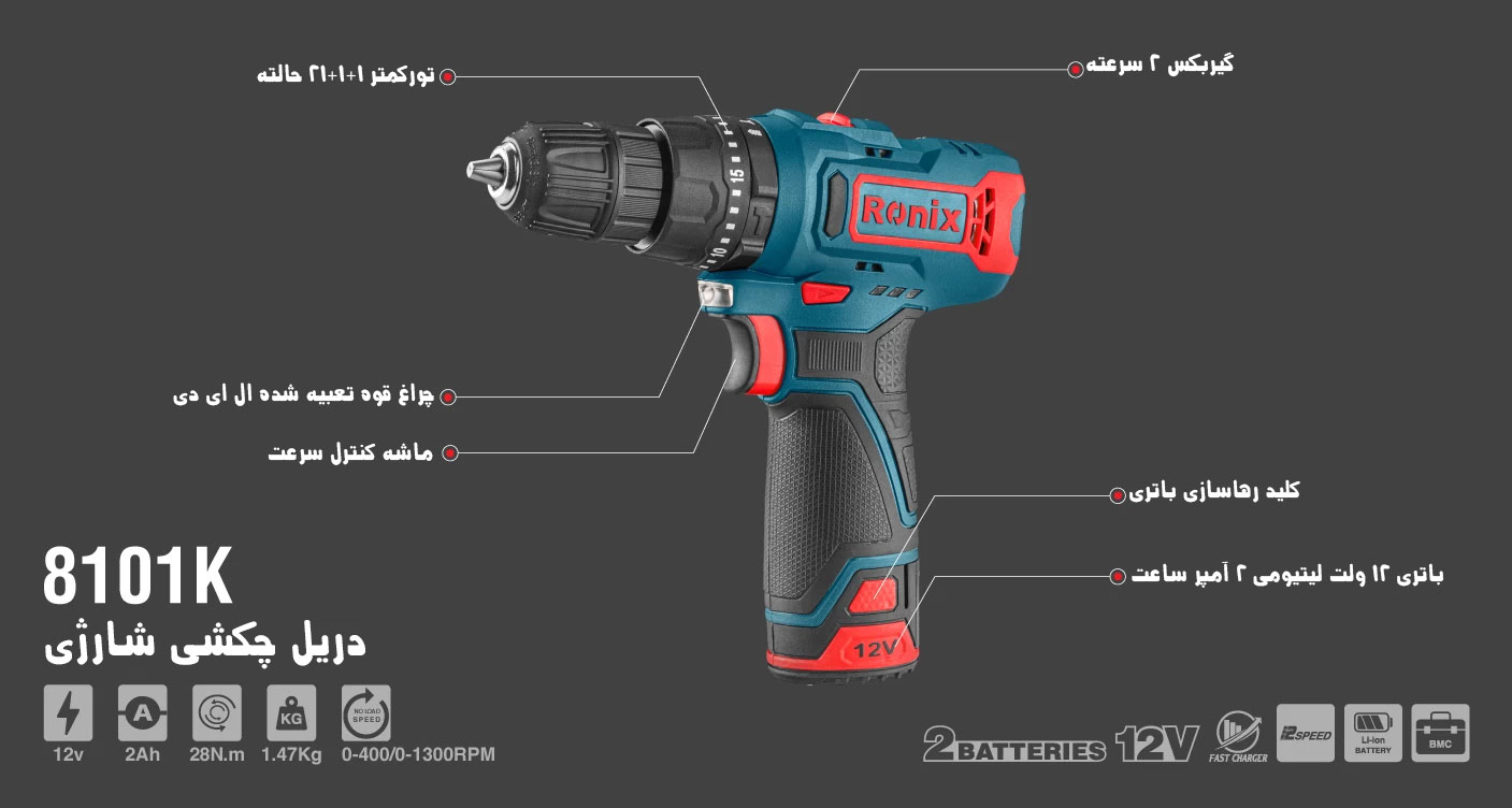 دریل شارژی چکشی رونیکس مدل 8101K یک ابزار بی سیم فشرده و قدرتمند با موتور 12 ولتی با راندمان بالا است که عملکرد عالی رادرحالتهای مختلف ممکن می سازد.
